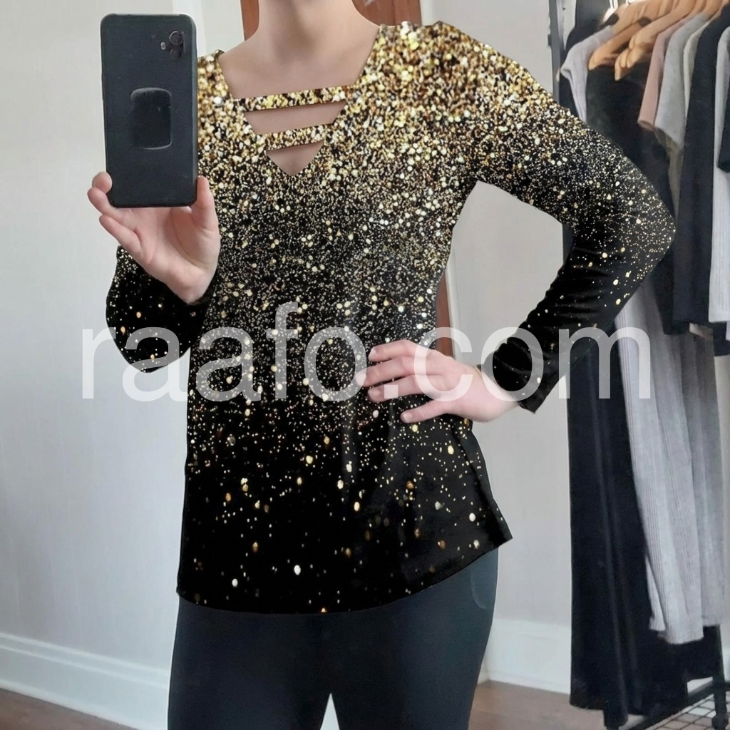 Just in time for your next glam holiday vacay! This sultry, strappy caged shirt has a v-neckline that awaits your favorite layering necklaces or statement jewels. This unique long-sleeved top sparkles with a generous sprinkle of metallic ombre silver and gold print, perfect for pairing with jeans or black slacks, boots, and metallic heels. Machine wash cold tumble dry low to medium heat. Iron if needed or lay flat to dry.
