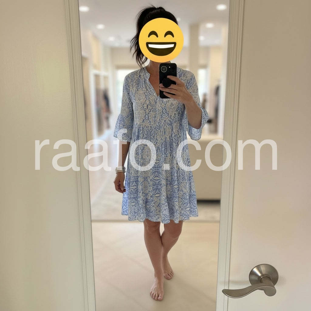Weathered Blue White Vintage Print Half Sleeve Mini Dress