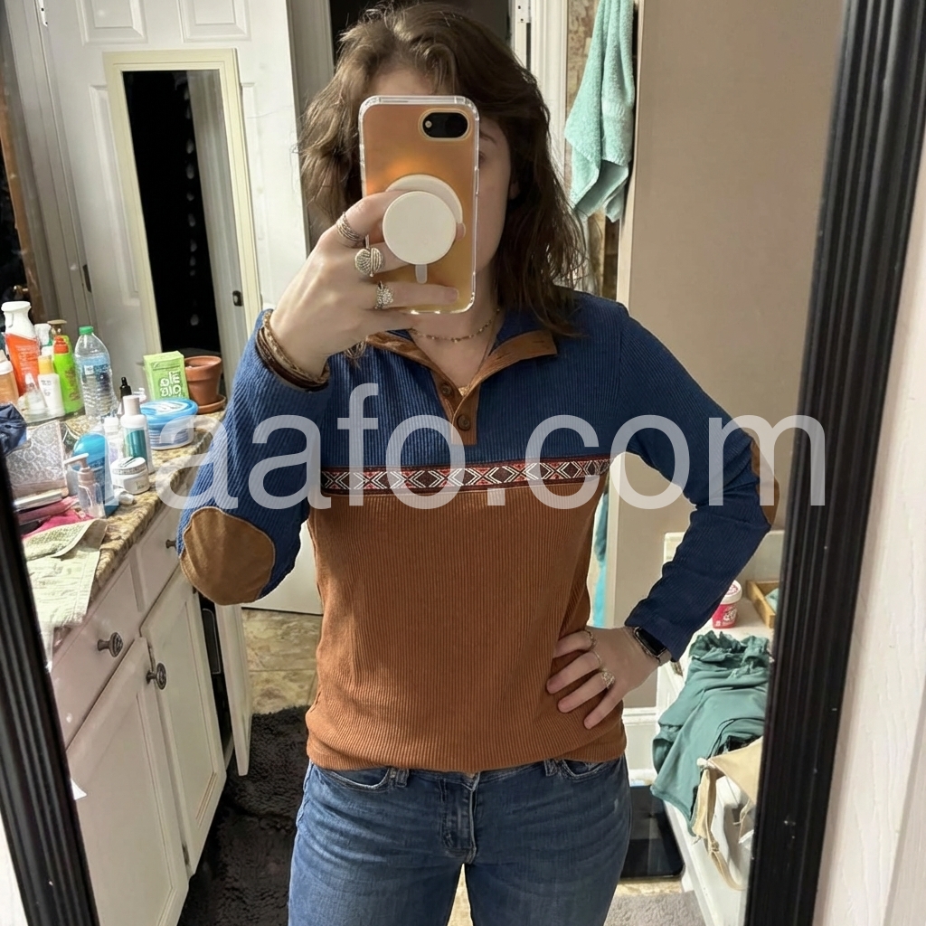 This top is cute. It’s a kind of a thin material. The sizing is true to size, the fabric is soft and comfortable. For size reference, I’m about 135 lbs, 5ft 2in tall, my bra size is 34D, I typically wear a 6 or 8 in jeans and a medium in tops, and I got this in a size medium.