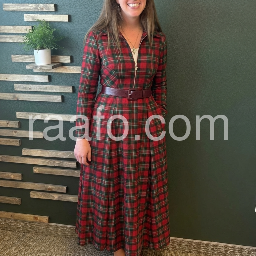 Distinctive Red Plaid Zip Front Long Sleeve Maxi Dress