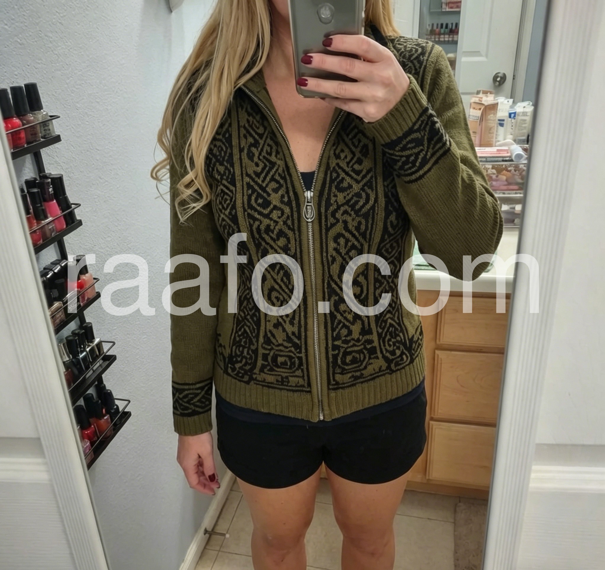 I’m obsessed with this vintage-style knit jacket! The earthy olive hue and ornate Nordic-inspired pattern feel so timeless and unique, way more interesting than basic sweaters. The wool-blend fabric is incredibly soft and insulating, perfect for layering over tees or turtlenecks. The fitted silhouette flatters my figure without being tight, and the silver zipper adds a sleek, polished touch. It’s become my go-to for weekend hikes, coffee runs, and even casual date nights—versatile, stylish, and so cozy!