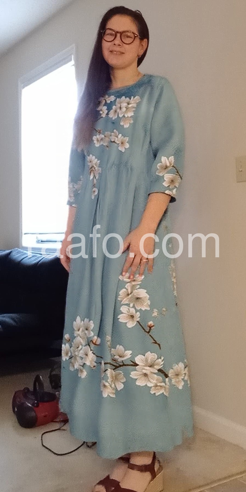 This dress is stunning! The light blue color with the floral design is perfect for a sunny day. It's comfortable and looks great both casually and for special occasions.