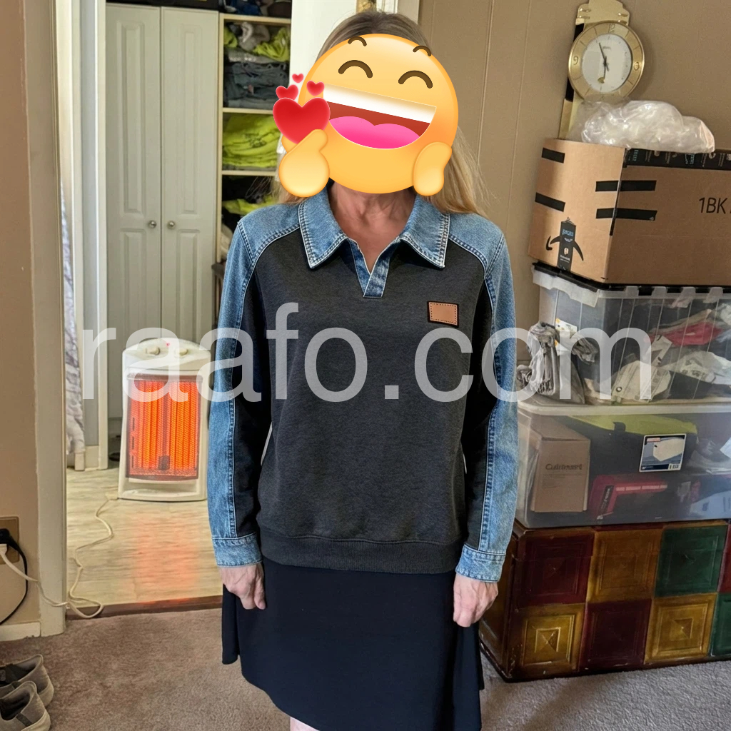 This shirt surprised me in the best way. The denim collar gives it a trendy, slightly edgy look, while the overall top is cozy and easy to wear. The fit is flattering without being tight, and the neckline feels secure—no awkward gaping or shifting as I move around. I also like the patch detail; it adds a quality touch that makes the whole piece look more expensive. I’ve worn it to brunch and also on a weekday errands day, and it works for both. After a wash, it stayed looking neat and the fabric didn’t pill.