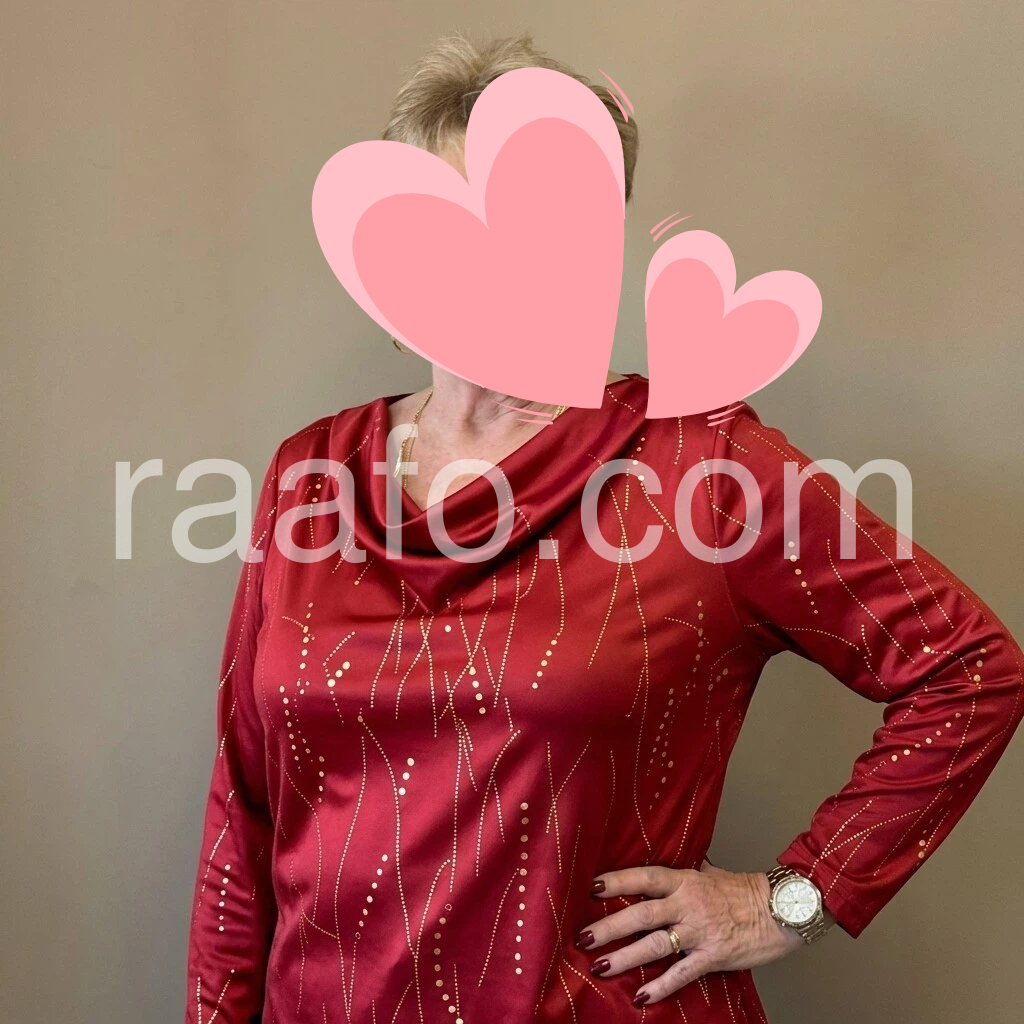 I absolutely love this top! The burgundy color is rich and the fabric has a nice look. The design pattern is subtle but beautiful, and it catches the light in a really flattering way. The cowl neckline is comfortable and adds a stylish touch. The sleeves fit well and the overall feel is smooth and nice against the skin. It matches the photos perfectly and looks great paired with jeans.