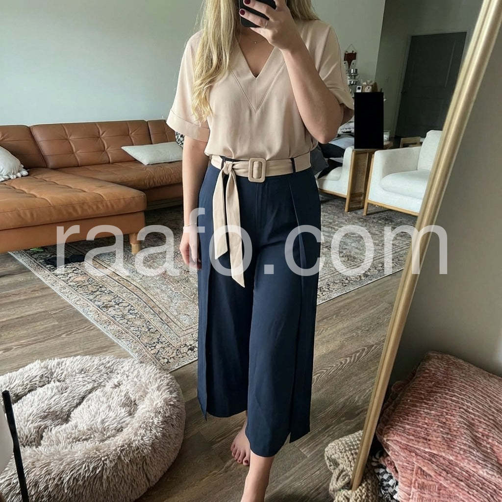 I bought this set for work and I am absolutely in love! The material is incredibly lightweight and breathable, perfect for summer days at the office. The belted waist cinches beautifully, giving a very flattering silhouette. Highly recommend!