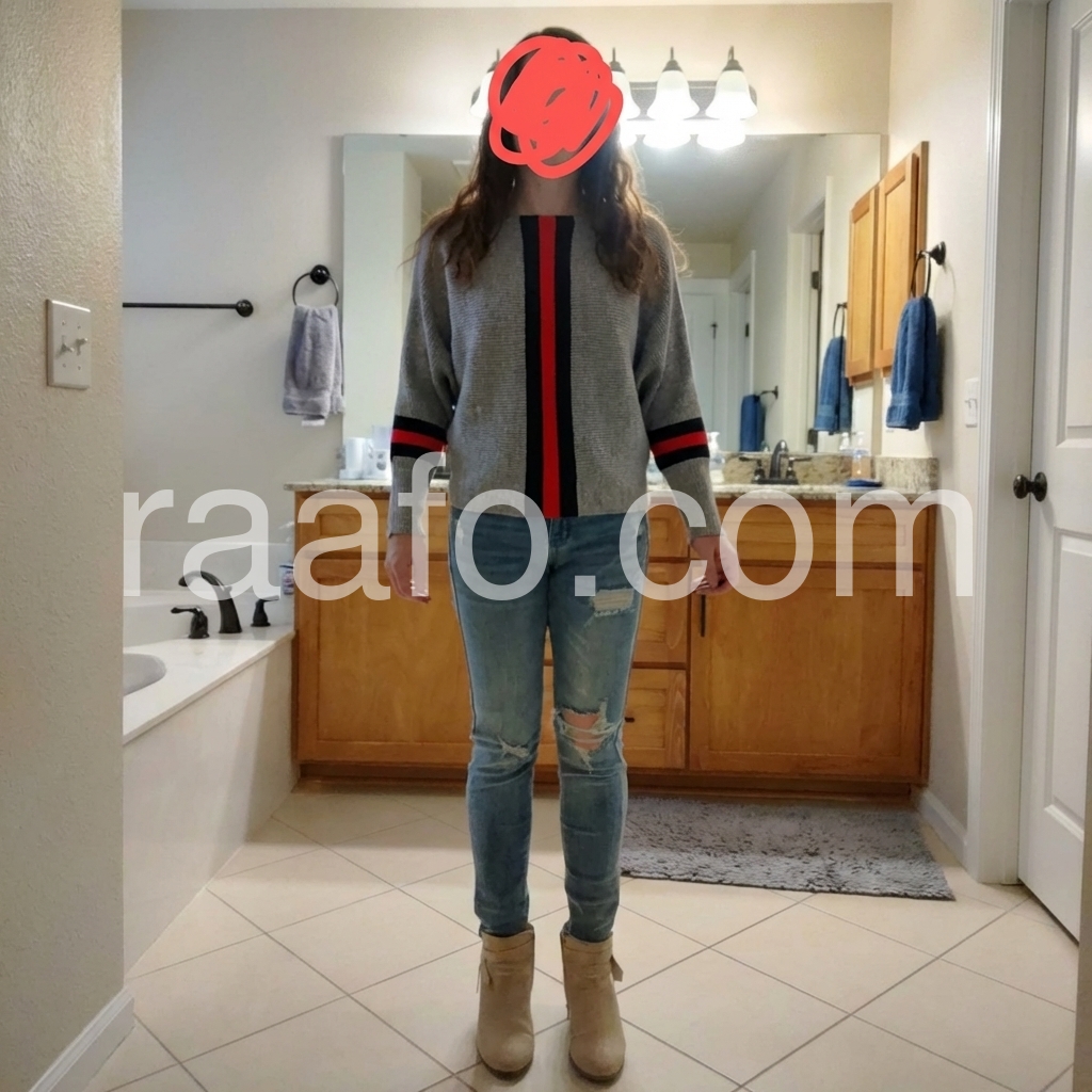 Bold designer-inspired red and black stripes down the front and on the long Dolman sleeves give this classic gray sweater an elevated look. Wear this versatile and comfortable little sweater to just about anywhere for a refined, laid-back style. Pair with black leggings, pants, and boots. Machine wash normal with light colors or hand wash. Bleach if needed. May be hung up to dry or lay flat. Tumble dry with low heat. Light ironing if needed.