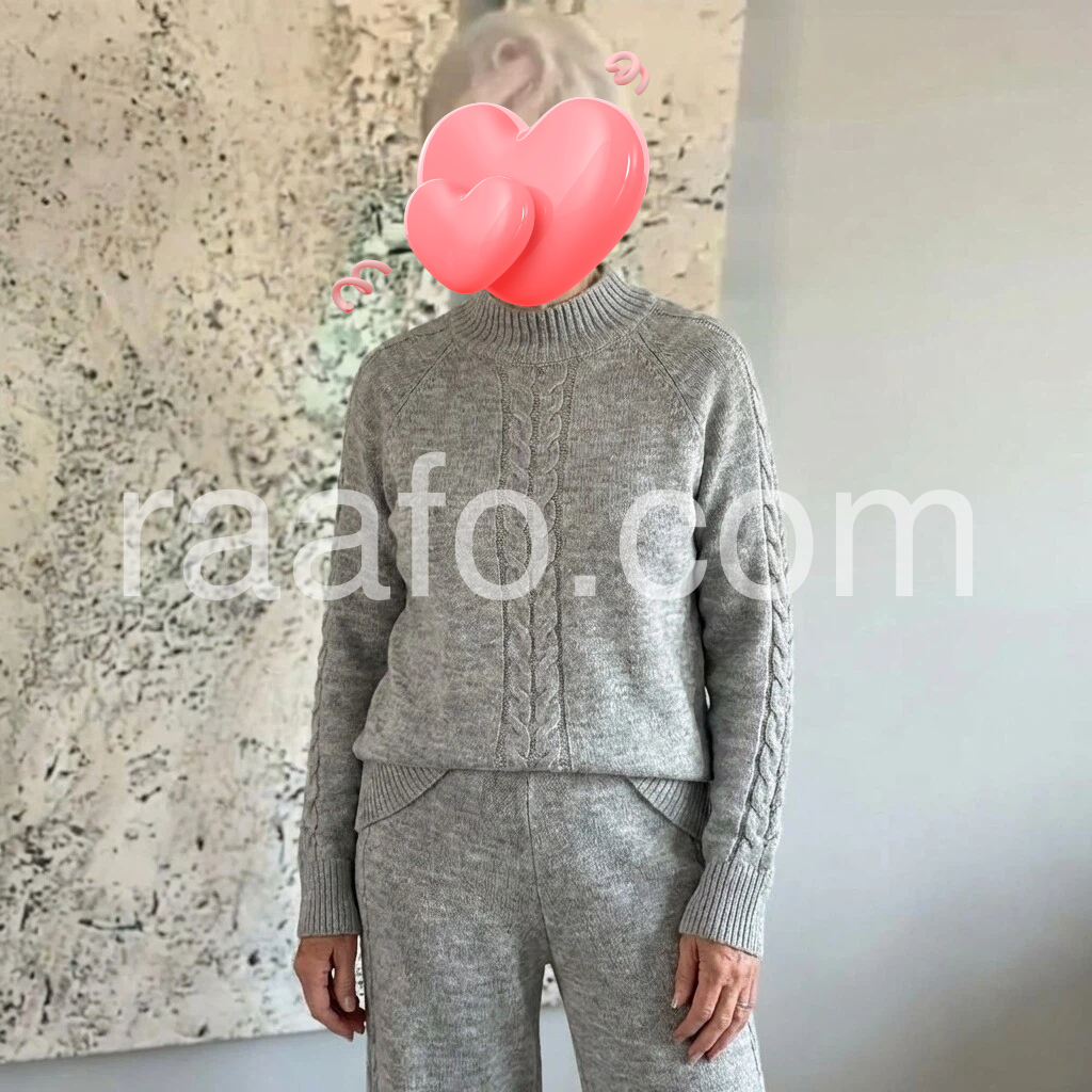 This is such a comfortable knit set. The sweater is cozy and the high neck cable pattern is beautiful. The matching pants fit nicely and feel smooth and soft. I’ve worn it around the house and also for running errands always looks great. It matches the listing pictures perfectly and I’m very happy with it.