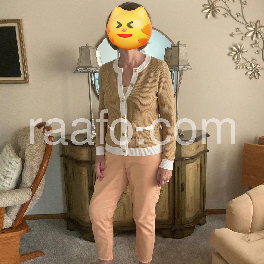 I’m obsessed with this cardigan! The quality is way better than I expected—no loose threads, and the knit is smooth and durable. The camel color is warm and timeless, and the white trim makes it look so polished. The gold buttons are sturdy and stylish, and the fit is true to size. It’s versatile enough to dress up with a skirt for work or dress down with jeans for the weekend. I’ve gotten so many compliments on it already!