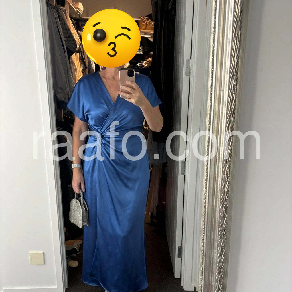 This blue satin maxi is stunning and perfect for online once you try it on at home. The wrap design with a waist knot creates a flattering silhouette, and the satin drapes beautifully. The color is rich and elegant, ideal for formal events or a classy evening out. Pairing with a small purse and simple sandals gives a polished, effortless vibe. True to size with good movement in the fabric. Smooth checkout and responsive customer support--highly recommended for a glam look you can wear online shopping with confidence.
