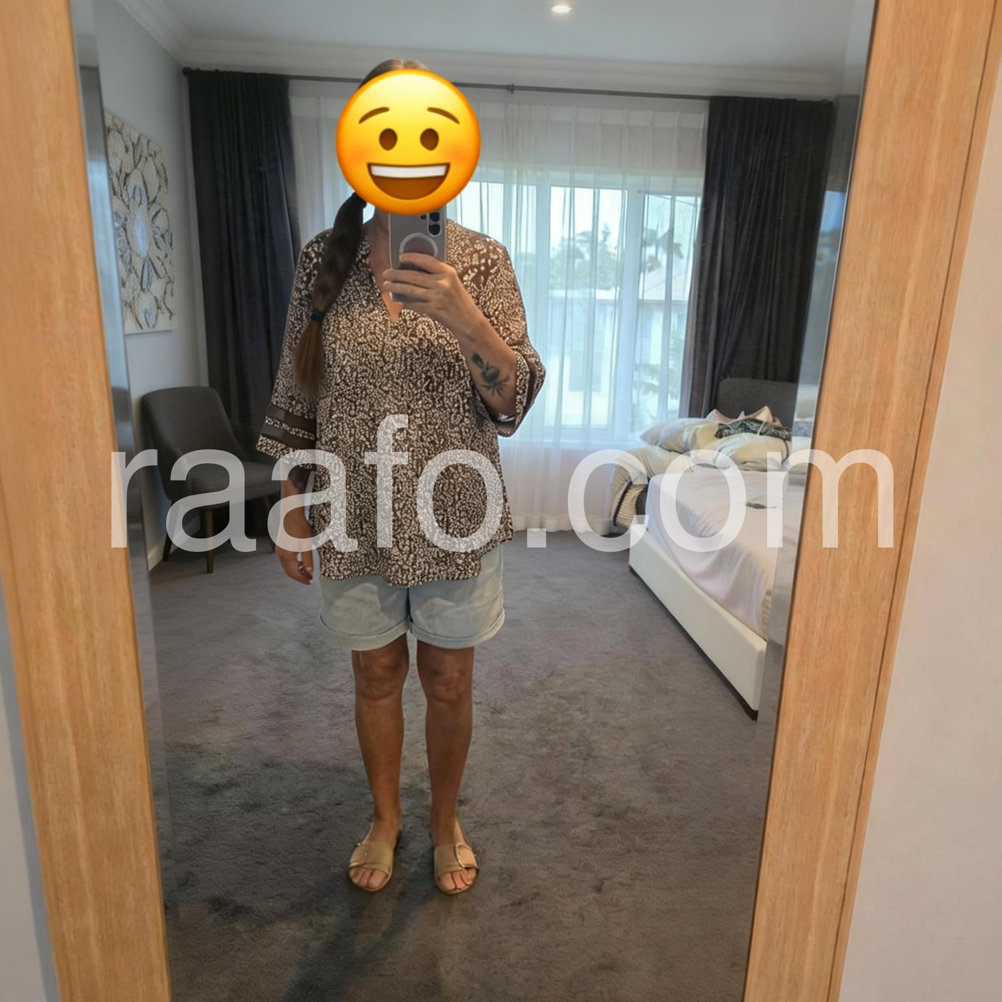 This blouse is so comfortable and lightweight. The v-neck is just the right depth and the sheer cutouts on the sleeves add such a fun, unique touch. True to size and very flattering!
