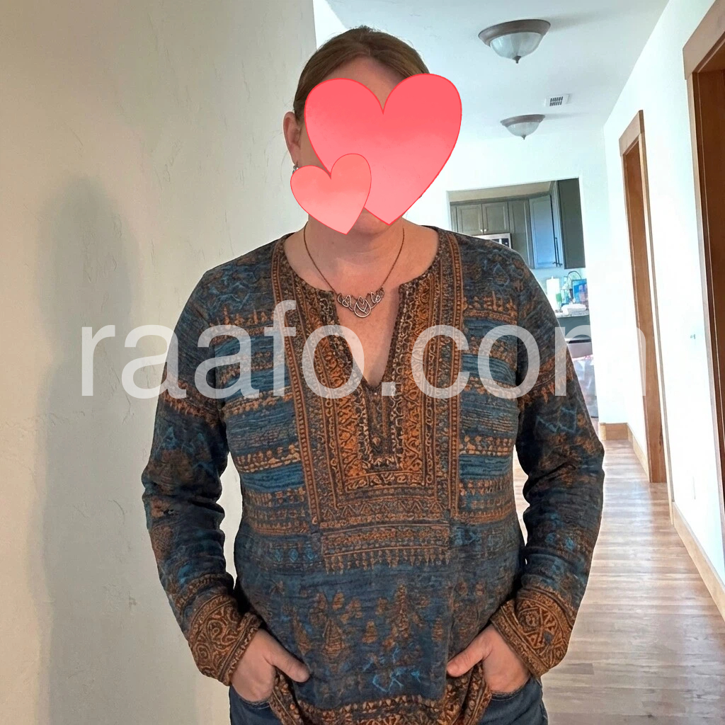 I love this tunic! The navy blue color and the detailed boho print are even prettier in person. The V-neck with the buttons looks great and the long sleeves are a perfect fit. It’s comfortable, falls nicely, and is easy to style with jeans or leggings. Looks exactly like the photos.