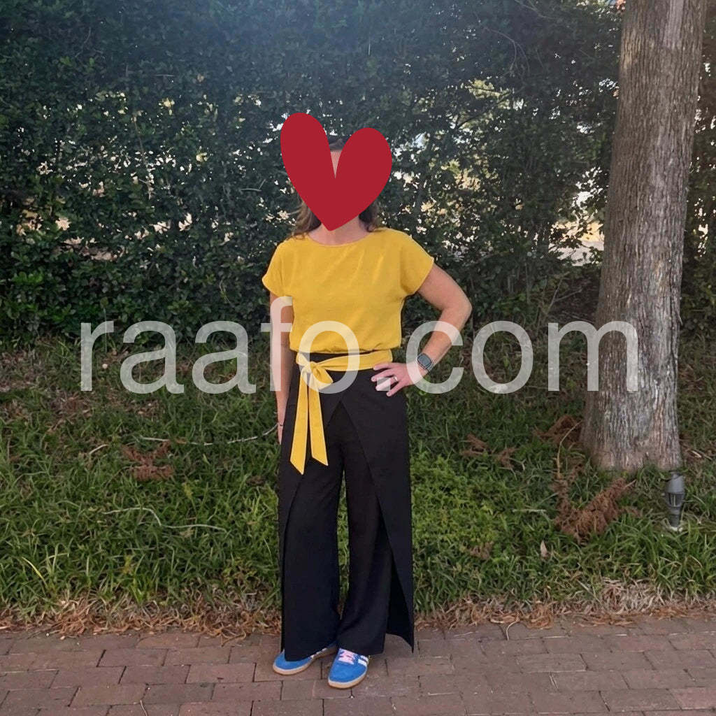 Love the bold color combo! The mustard-yellow top is airy and flattering, and the wide-leg black pants with the yellow waist tie create a chic, modern silhouette. Perfect for casual days out.